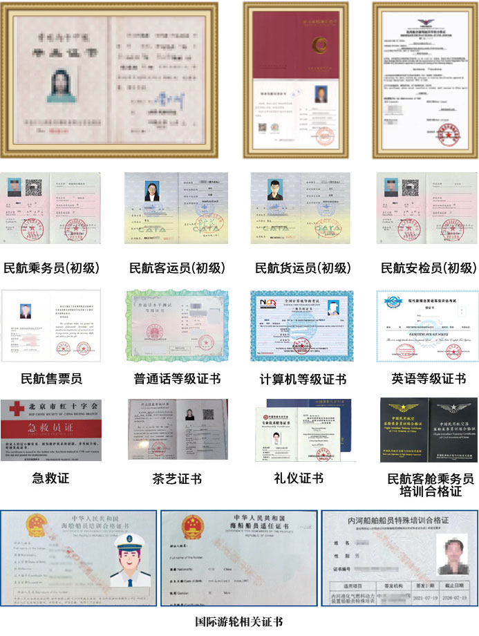 可根据所学专业,参加相关部门或行业组织的考试,成绩合格,可取得相应的职业资格证书,如公共英语三级、普通话等级证书、安检证书、民航客运证、急救证、海员证书、礼仪证书、茶艺证书、民航客舱乘务员培训合格证等。